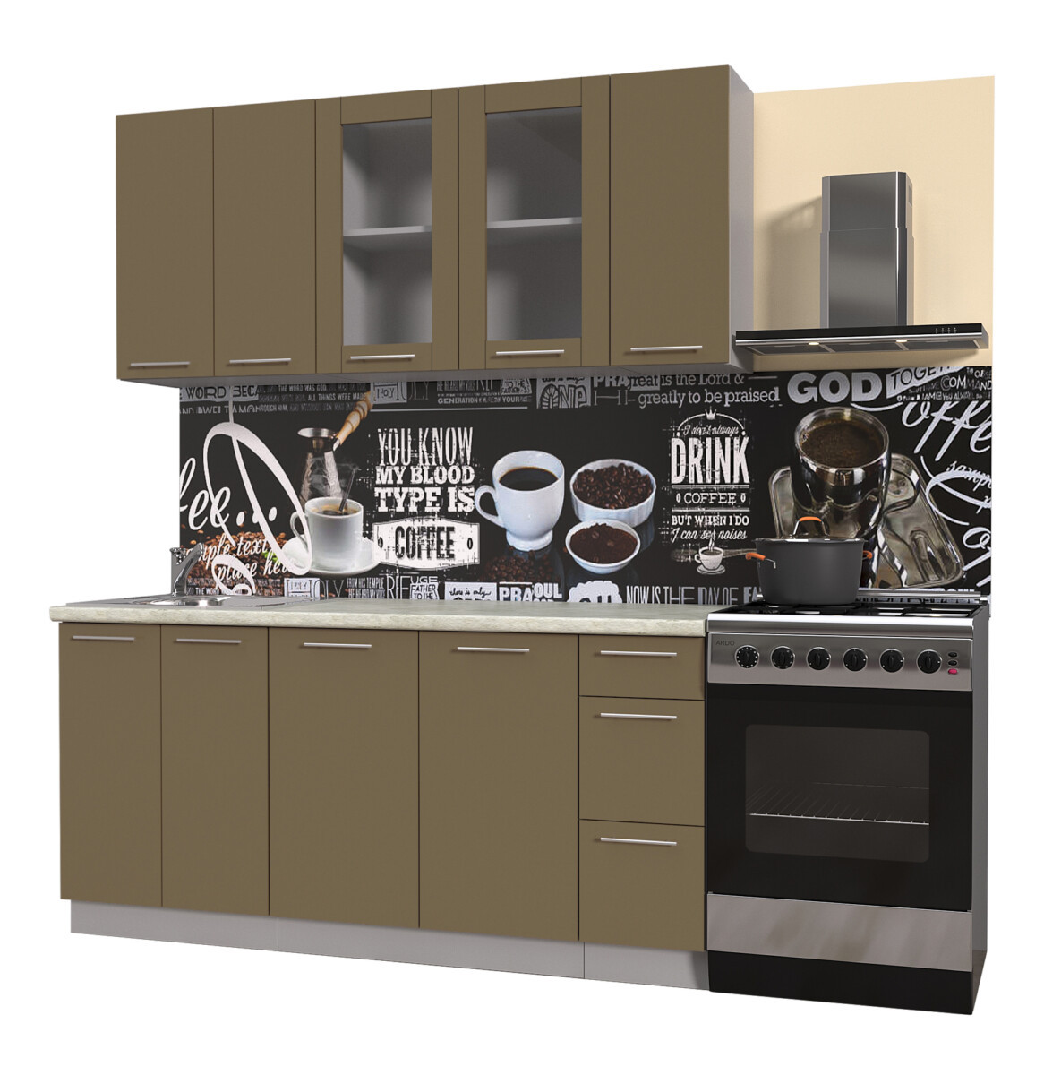 | Столешницы | Белый гранит, Дуб бунратти, Кастило темный, Малага, Опал светлый, Сосна бискайская, Травертин серый |